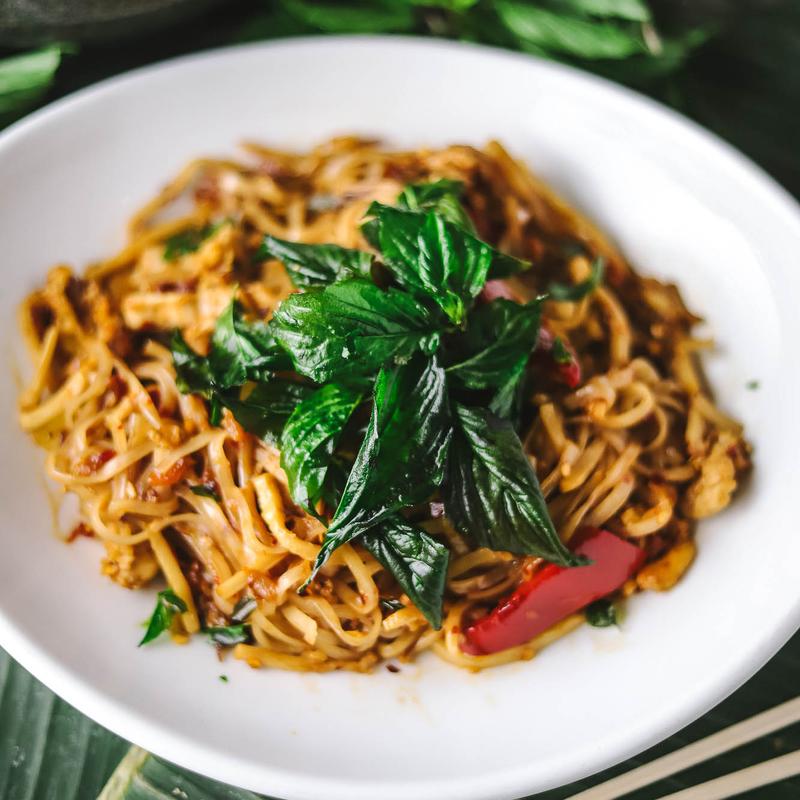 Rice noodles and chicken stir fried in a smoked chili sauce with basil.